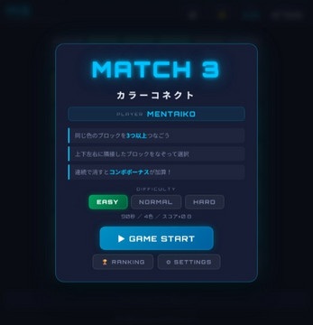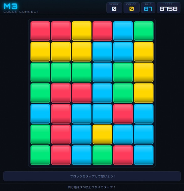 Match 3 - Color Connect is a minimalist, fast-paced puzzle game built entirely with modern web technologies (HTML5, CSS Grid, and Vanilla JavaScript). No Canvas, just pure DOM manipulation for a crisp and responsive experience on any device.